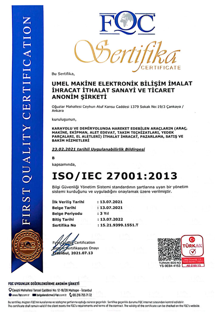 Umel Machinery Electronic IT Man. Imp. Exp. Ind. Trd. Co established as a subsidiary of Elit Project Consulting Contracting Trade Inc. -Elron Construction Contracting Trade Ltd. Co.in the field of machinery design and manufacturing especially activities on railways sector. After company started its activities it became one of the major companies of Turkey in a short term.